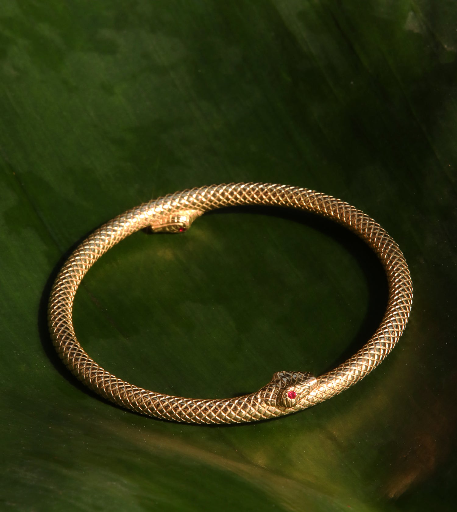The Amazon serpent bangle draws inspiration from the Amazon River, coiling around the rainforest resembling a snake.This handcrafted piece pays tribute to the Amazon river by portraying one of the animals that call it home.