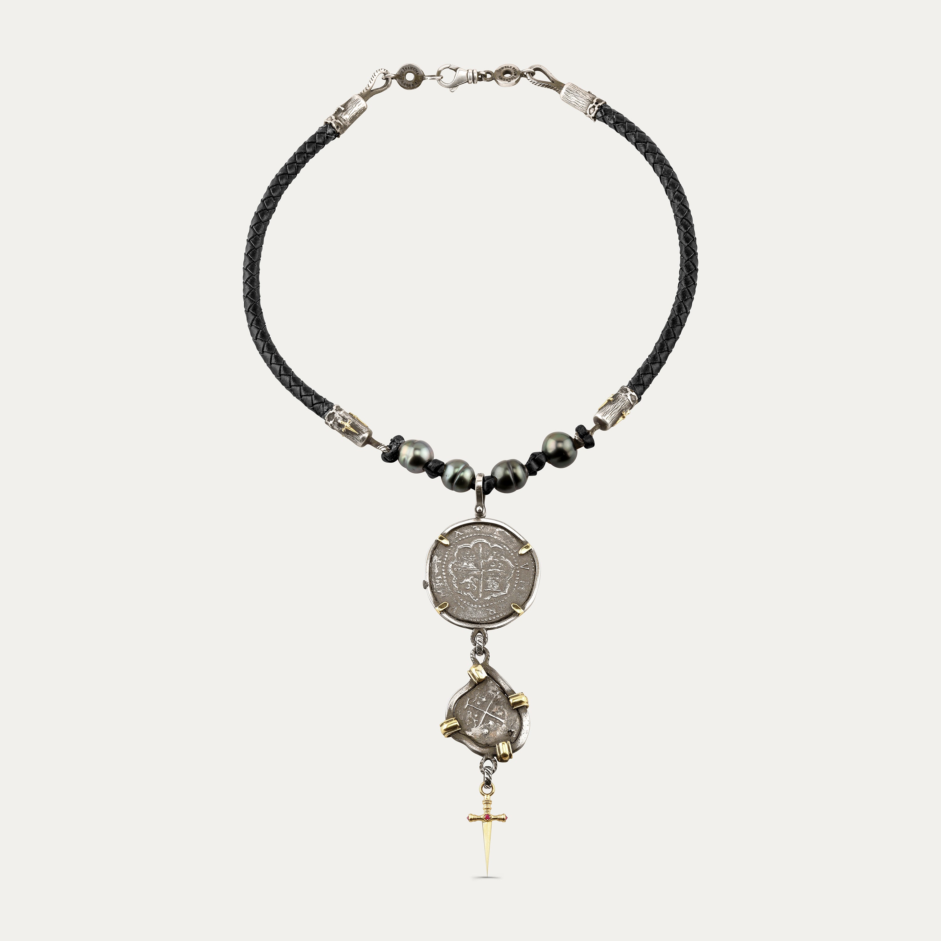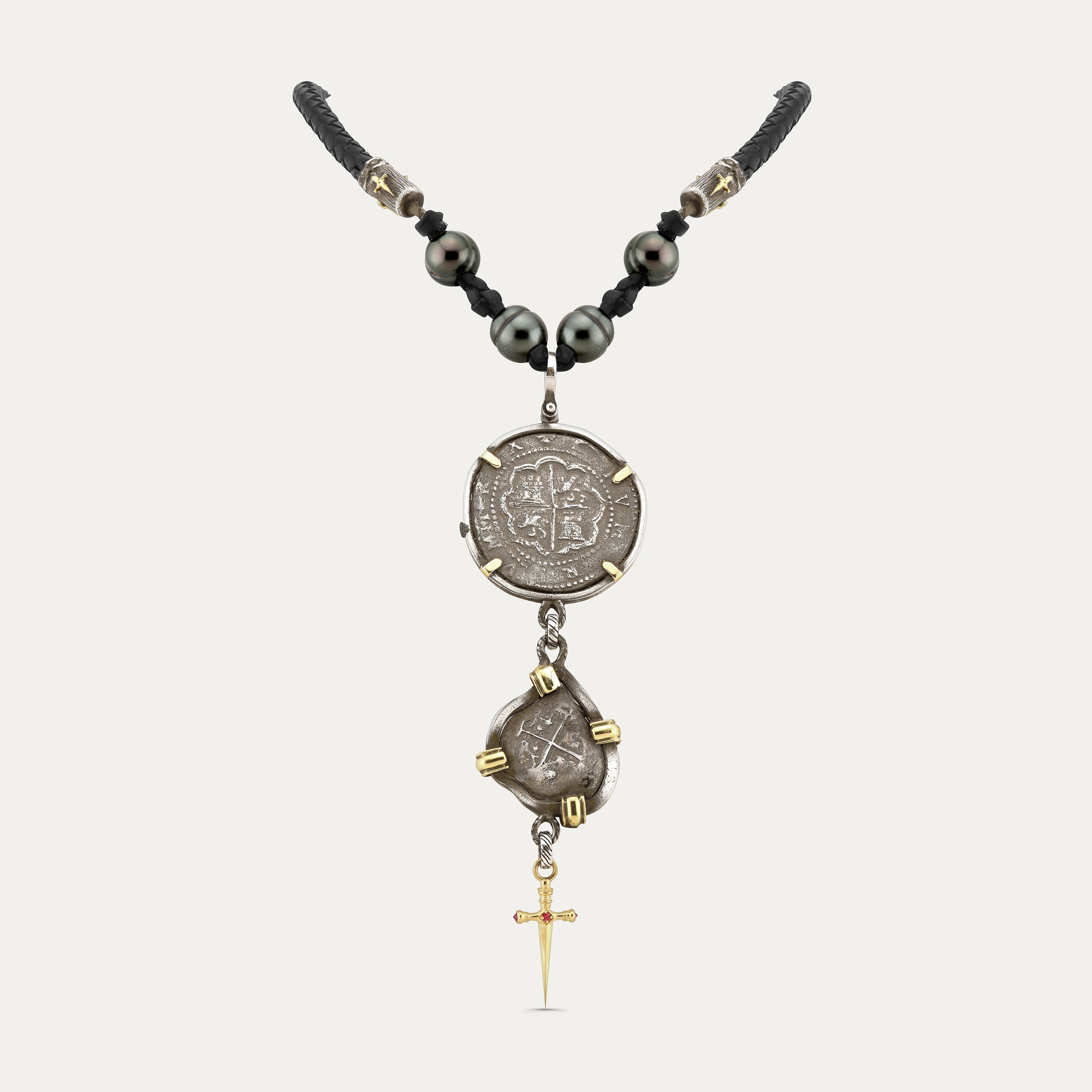 Alice wears a custom-made Jewels from Ipanema necklace featuring black Tahitian pearls and Spanish coins.